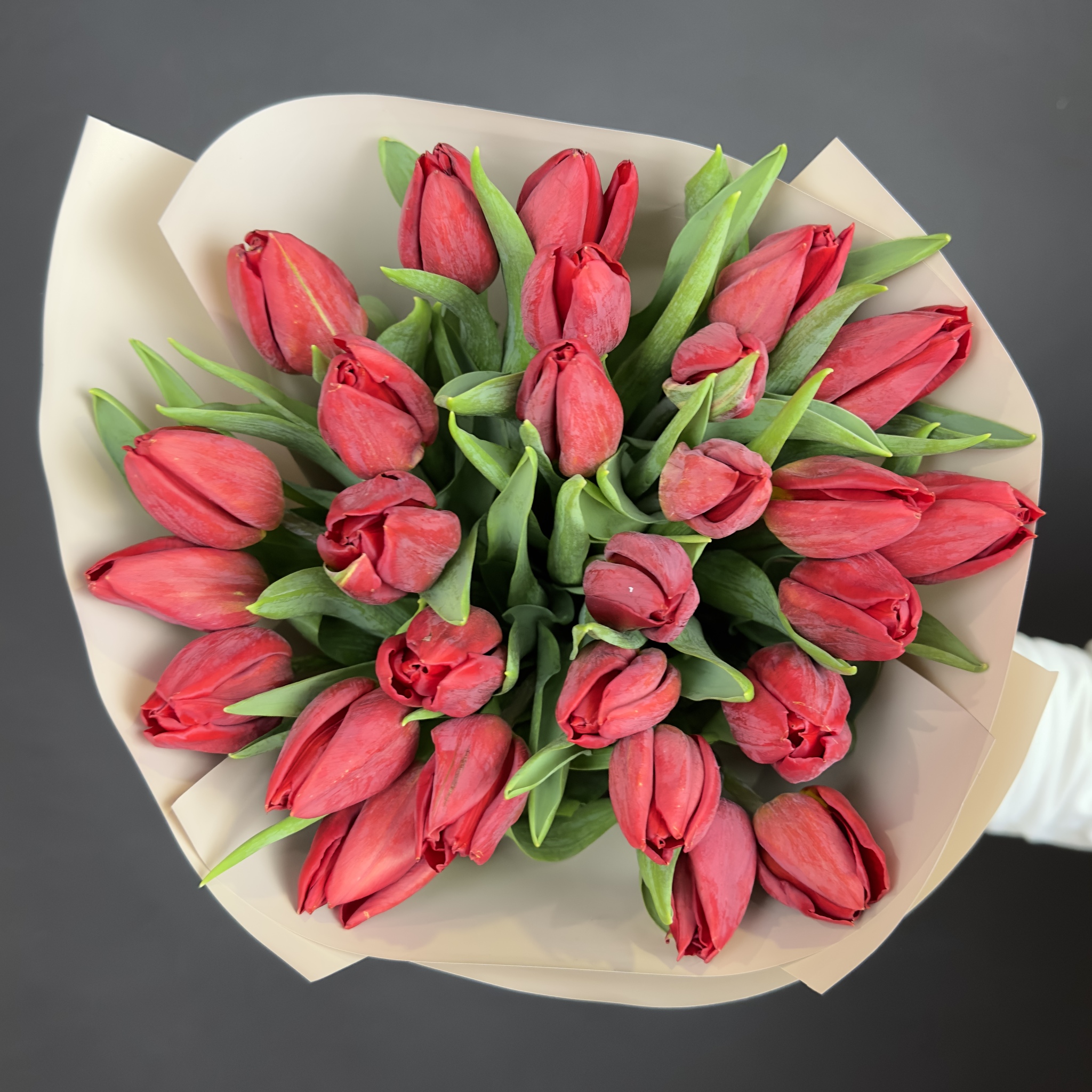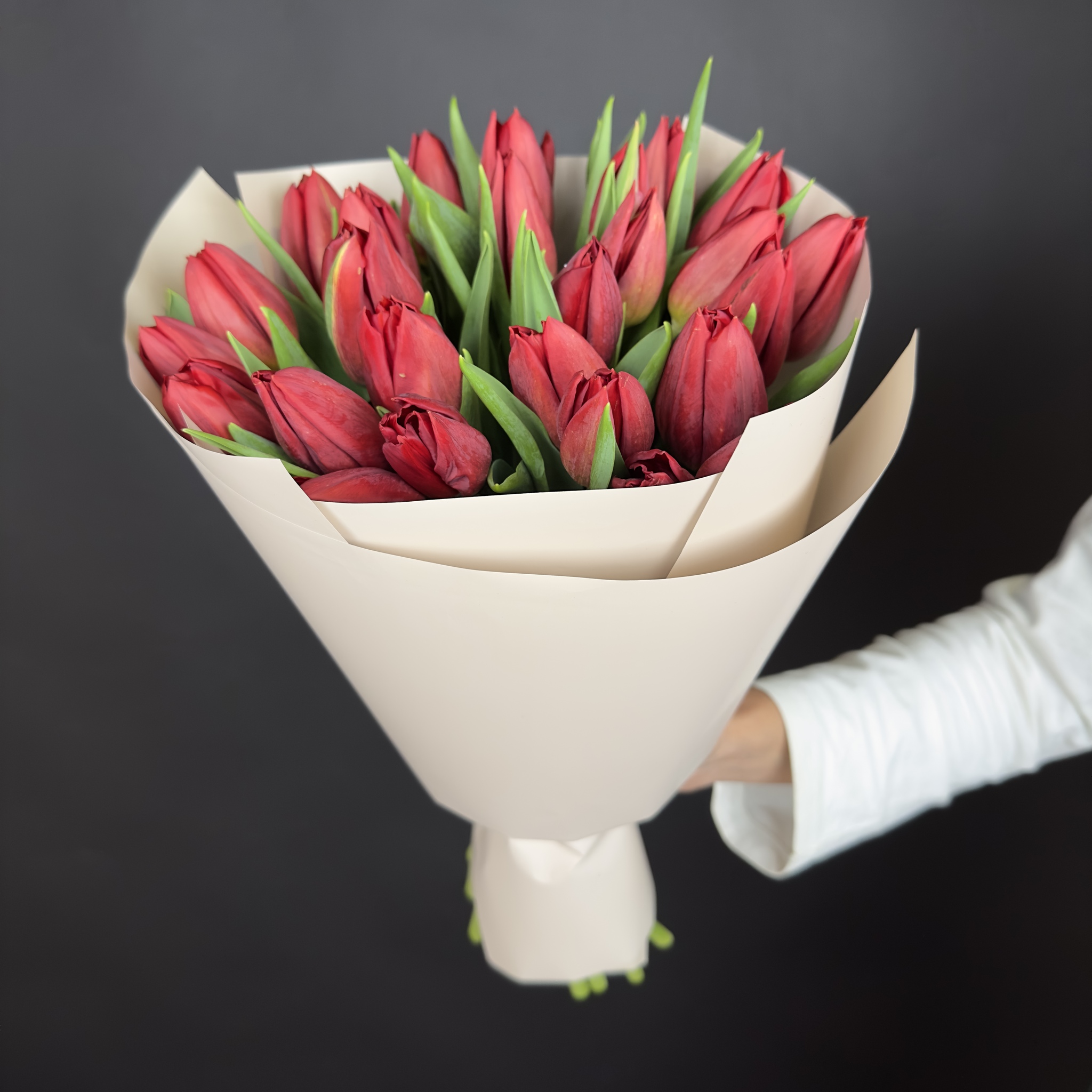 A bouquet of 25 bright red tulips is a real symbol of love of life, sunny positivity and a real spring mood. Please your loved one with this wonderful bouquet!