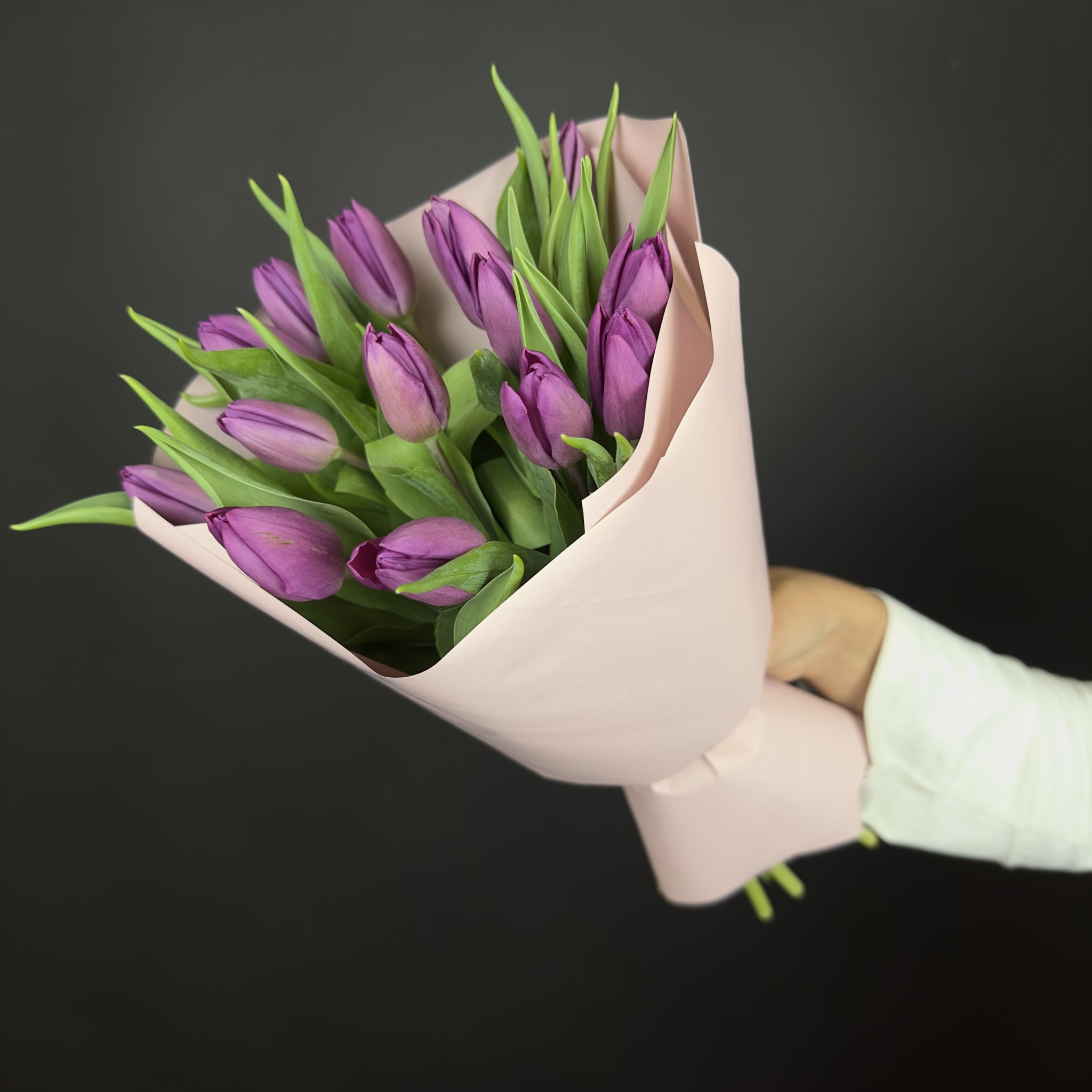 A small bouquet of 15 bright violet tulips is a perfect surprise for your loved ones not only on March 8, but also on any other day.