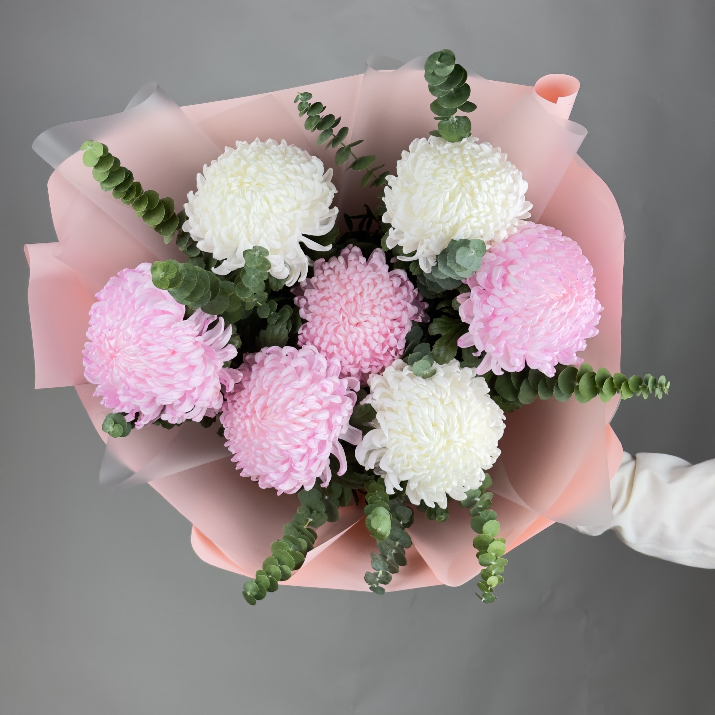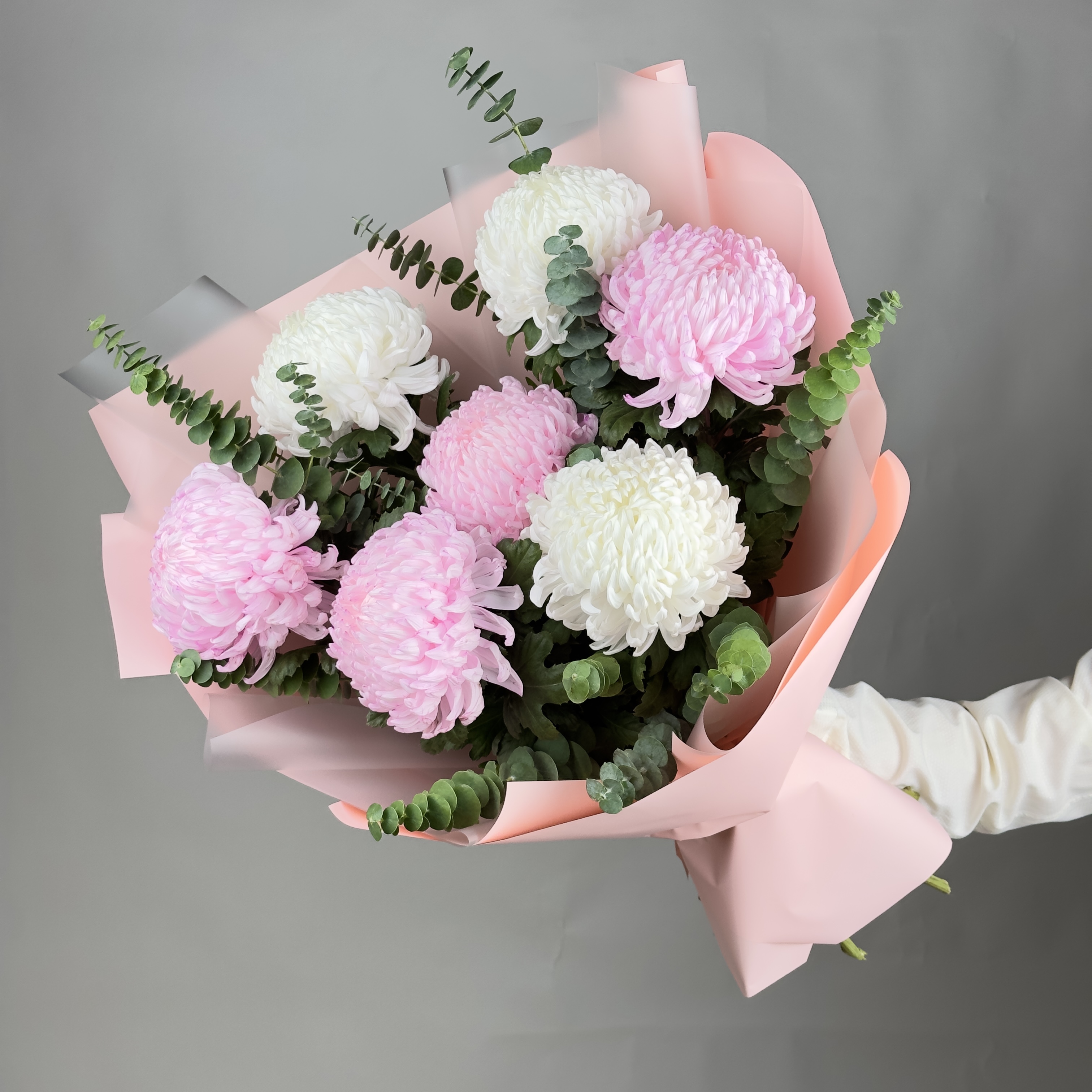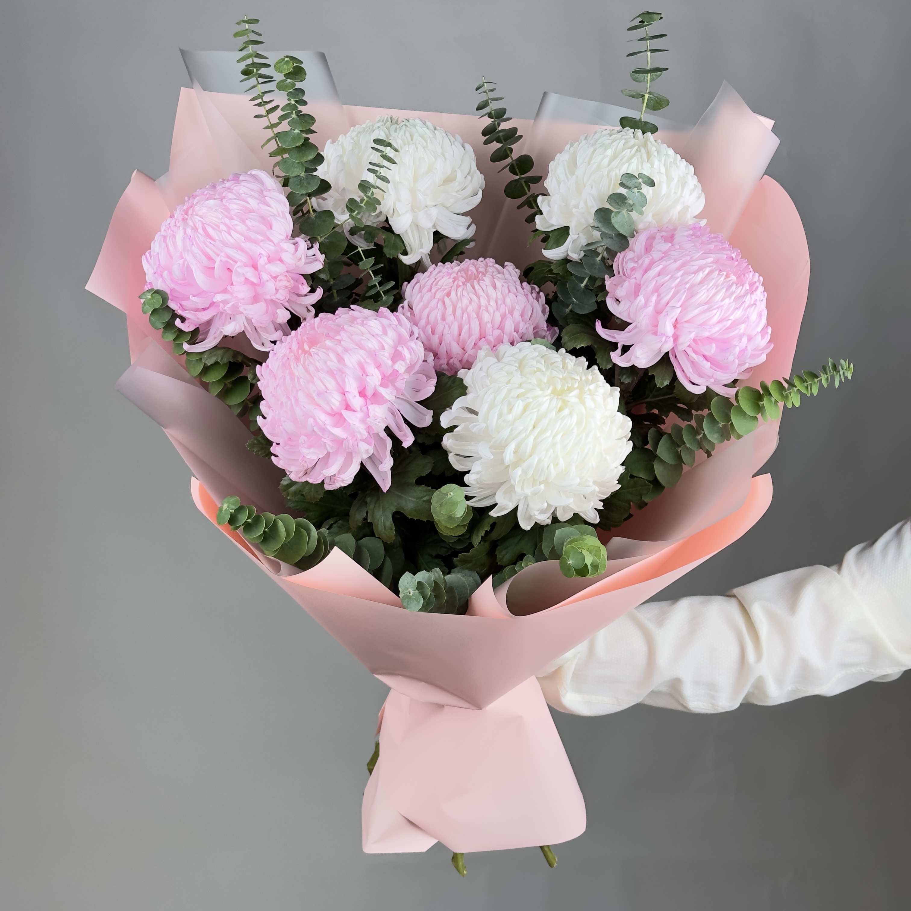 Нежнейший букет из семи хризантем Бигуди в изысканных розово-белых тонах — символ чистоты эмоций и искренних чувств. Позвольте своим родным испытать радость от этого великолепного подарка! Пусть прекрасное настроение станет частью вашей жизни и торжеств благодаря этому очаровательному букету!